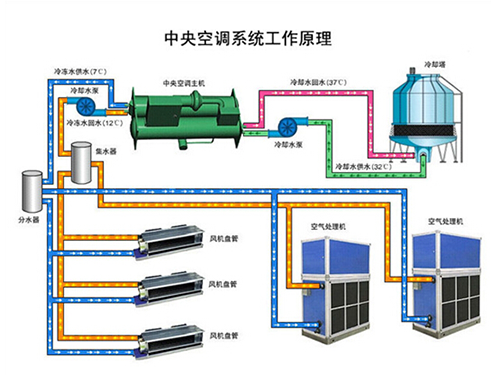 水冷中央空調包含四大部件,壓縮機、冷凝器、節(jié)流裝置、蒸發(fā)器,制冷劑依次在上述四大部件循環(huán),壓縮機出來的冷媒(制冷劑)高溫高壓的氣體,流經(jīng)冷凝器,降溫降壓,冷凝器通過冷卻水系統(tǒng)將熱量帶到冷卻塔排出,冷媒繼續(xù)流動經(jīng)過節(jié)流裝置,成低溫低壓液體,流經(jīng)蒸發(fā)器,吸熱,再經(jīng)壓縮。在蒸發(fā)器的兩端接有冷凍水循環(huán)系統(tǒng),制冷劑在此次吸的熱量將冷凍水溫度降低,使低溫的水流到用戶端,再經(jīng)過風機盤管進行熱交換,將冷風吹出。