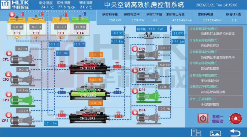 一鍵開關(guān)機(jī):直接操作設(shè)備啟停。實現(xiàn)機(jī)組群控及冷凍水,冷卻水系統(tǒng)聯(lián)動。