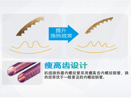 TURBO-B蒸發(fā)管,制冷劑在管路內(nèi)壁形成液膜,針對(duì)不同傳熱機(jī)理、流體介質(zhì)設(shè)計(jì)的特殊換熱表面,提高了殼管換熱效果,同時(shí)降低沿程流動(dòng)壓力損失,減小機(jī)組能耗