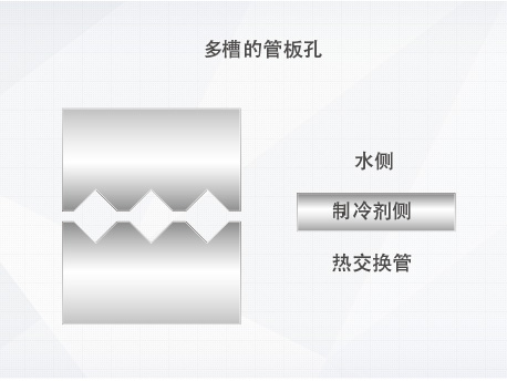 多槽管板設(shè)計(jì)先進(jìn)的3V槽管板,保證換熱管與管板的連接強(qiáng)度,換熱管與管板機(jī)械脹接密封,在脹接處設(shè)置三道密封凹槽,提高密封可靠性。